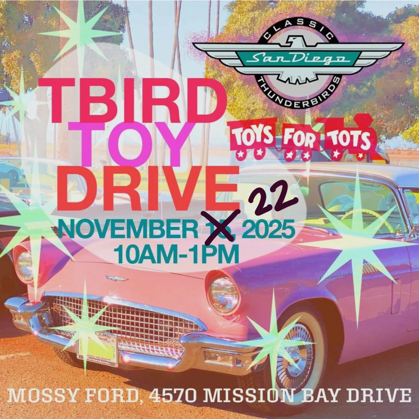 Grab your coffee and your classic car — it doesn’t have to be a Tbird — and join us. This is our 20th year supporting this worthy cause. This event was originally scheduled for Nov 15, but due to the storm in San Diego, it has been postponed to Nov 22.